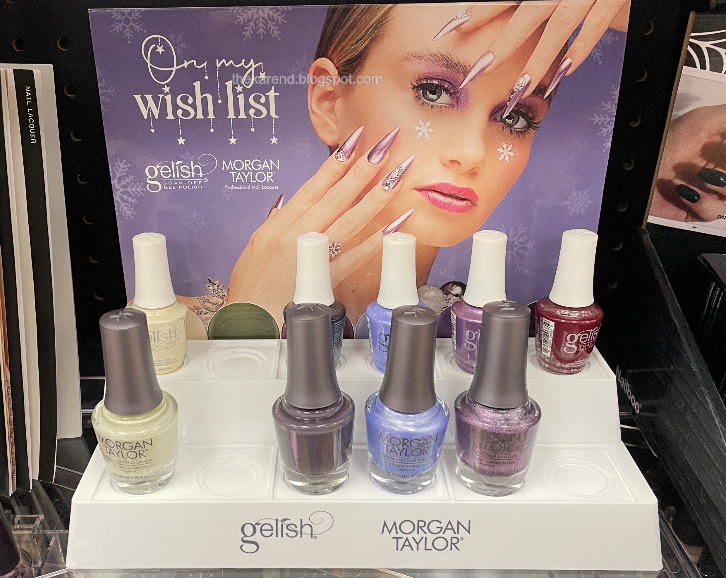 Sally Beauty had Morgan Taylor's On My Wish List collection, with regular polish in the front row and Gelish in the back. Left to right: Dew Me a Favor, empty slot for Bad to the Bow (moss green), A Hundred Present Yes, Gift It Your Best, Before My Berry Eyes, and Reddy to Jingle.