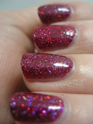 I like Tinsel Time much better on me when layered over a more complimentary color.