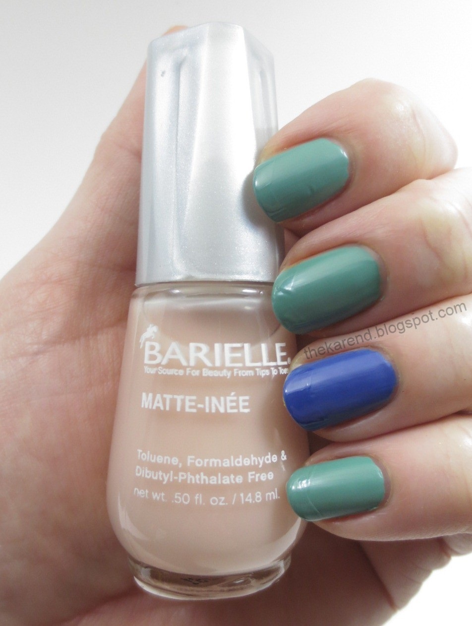Barielle also sent their matte topcoat, Matte-inée. Actually, the topcoat part is not its primary purpose; it's designed as a nail protector. The back of the box describes it as having a "blend of strengtheners & conditioners" but also notes that it "dulls the hight luster shine of color polish to provide a stain finish".