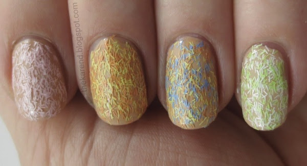 I started slow, with one coat of the fuzzies over Sally Hansen Complete Salon Manicure in Malt. Left to right: Fuzzy Fantasy (pink and white), Peach Fuzz (pastel yellow and light orange), All Yarned Up (pastel yellow, light orange, and light blue), and Fuzzy Fantasy (white and lime).