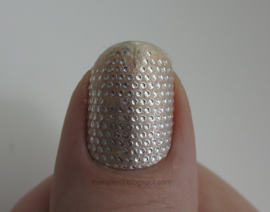 I chose Glam It On for my maiden voyage with these strips. This design has raised silver dots on a peach background.