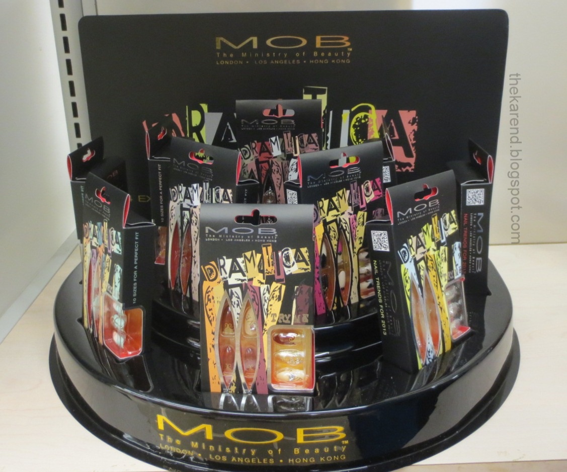The most recent new thing I've seen at Rite Aid are Dramatica fake nails from MOB (Ministry of Beauty). These sets of fakes have very elaborate designs, some with jewels or studs or other ornamentation, and all sets have a mix of designs on a theme. The nails themselves are oval/almond shaped.