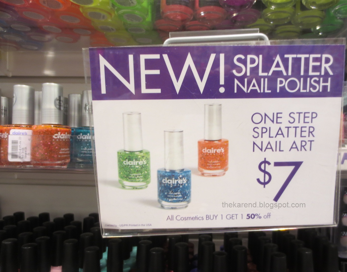 Since I was on a photo taking roll after Icing, I snapped a shot at Claire's (which follows the same shove it on shelves nail polish display ethos) of a sign touting their Splatter Nail Polish. Near as I can tell, what they mean by splatter is black and white glitter in various bases.