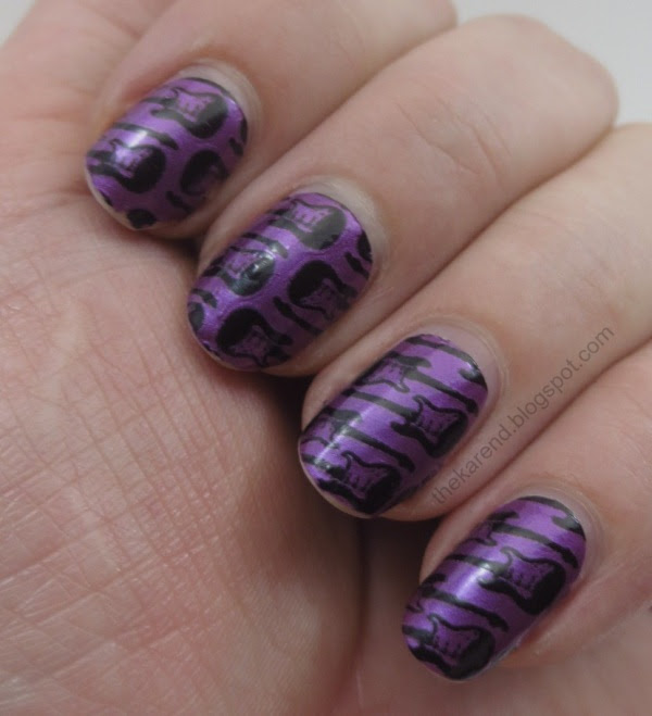The next set of strips I wore I put on not in a hotel room but in the car, sitting in the passenger seat as Mr. Karen was driving us on a little road trip to see a concert. The black guitars on bright purple motif of the Amp It Up Salon Effects strips from Sally Hansen were perfect for the event, so I'm glad I remembered I had them (they're from the Rock of Ages LE collection from 2012). Because they were purple, I kept them on a lot longer than the giraffe ones; they made it through the whole work week after the concert weekend.