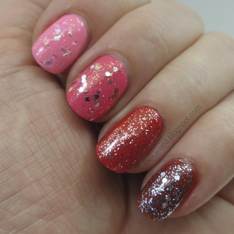 Twinkled Pink has large silver and iridescent golden orange hex glitter and small iridescent golden orange glitter in a sheer medium pink base.