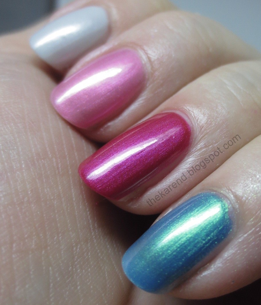 Four light shimmers are next up: Great White (white), Clam Up (pink), Drama Sheen (warm lilac), and Pool Party (baby blue). I used three coats of each of these, no topcoat, and that didn't get me quite to full coverage. I don't mind these with a hint of visible nail line, though. Great White is the odd one out in this quartet as far as finish; its shimmer is more flecked while the other three are more pearlescent (and prone to show brushstrokes).
