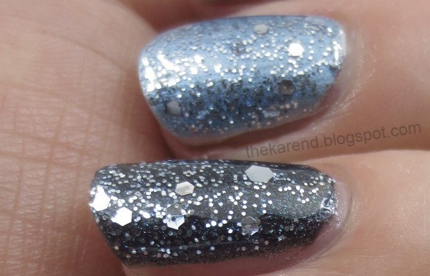 I was having fun, so I kept playing with layering. For this next look, I put the silver Oyster Bar on most of my fingers, with Slick Black as an accent nail, then I added two coats of Sparks Fly plus the Triple Shine Top Coat. The combination of the glitter and the blue base nicely distract from Oyster Bar's brushstrokes, while the base gives the silver shimmer in Slick Black a blue tone, nicely complementing the silver glitter.