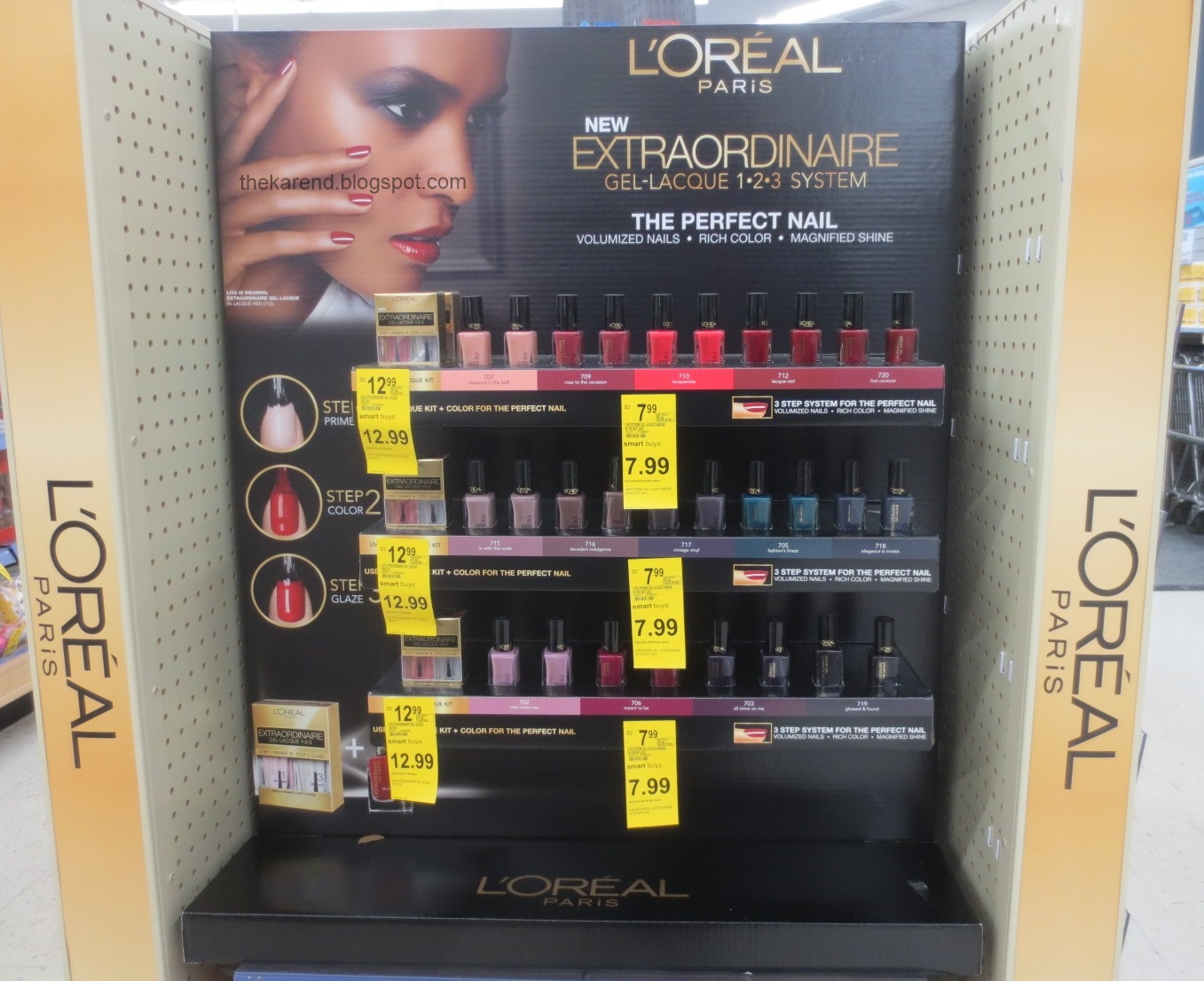 Bopping back over to Walgreens, they had an endcap display with a new line from L'Oreal, Extraordinaire, which is a three-step gel lacquer system (no lamp involved; seems similar to Revlon Colorstay, with its dedicated base and top coats). There are fourteen colors in addtion to the base and top coat, starting at top right: Diamond in the Buff, Rose to the Occasion, Lacqueriste, Lacque-red, Hot Couture, In With the Nude, Decadent Indulgence, Vintage Vinyl, Fashion's Finest, Elegance is Innate, Miss Luster-ess, Meant to Be, All Shine on Me, Glossed & Found.