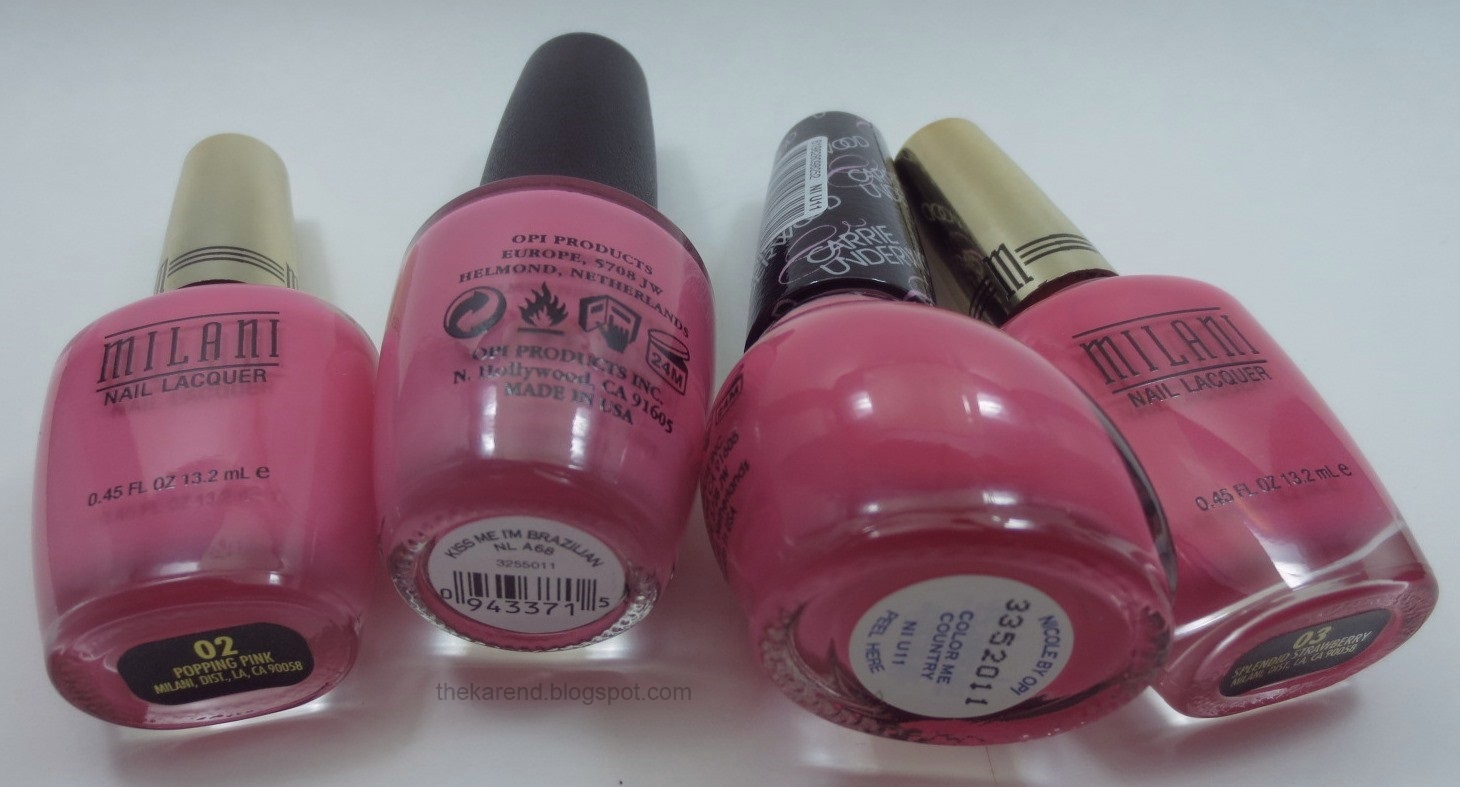 Surely I could find a dupe for Kiss Me I'm Brazilian. It's pink, and I have many many pinks. I didn't even have to go into my Helmers to find likely candidates; I just pulled from my recently swatched and soon to be swatched piles and found two Milanis and a Nicole by OPI. Left to right: Milani Popping Pink, OPI Kiss Me I'm Brazilian, Nicole by OPI Color Me Country, Milani Splendid Strawberry.