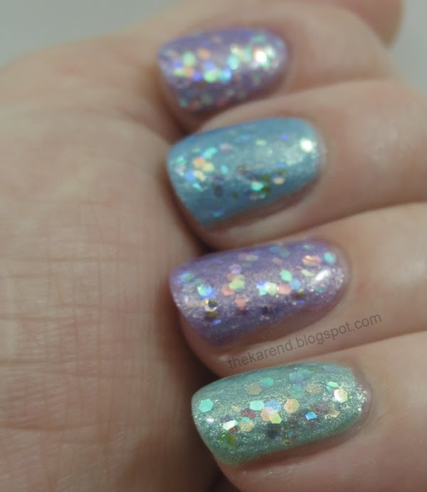 When I went to Sally Beauty this past weekend, Ice Cream Shoppe was gone. In its place was Fresh Picked, four milky bases with multi glitter: Fresh as a Daisy, So Re-leafed, Petal Pusher, and Mulberry Affair.