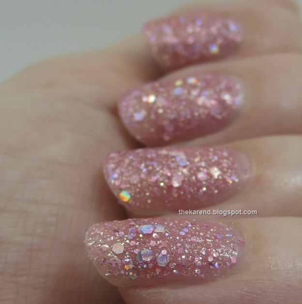 I generally prefer finer-grained textures, so I probably would add topcoat if I wore Magical Pixies for a full mani. Here's Ginni all smooth and shiny: