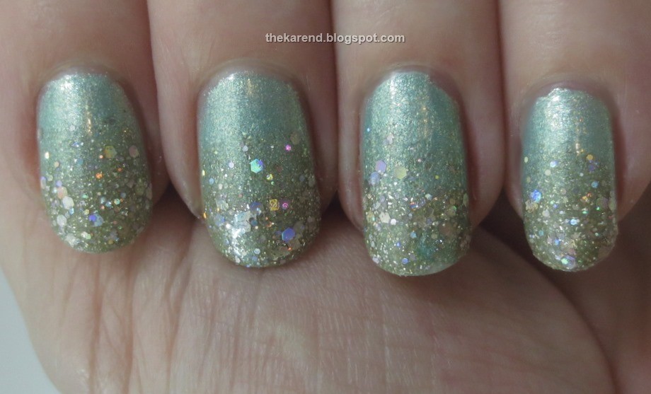 I wanted to have a little more fun with these Pixies, so I tried a glitter gradient with Bar over Zoya Dillon from the Awaken collection. I used two coats of Dillon, then stroked Bar on as lightly as I could, first a coat from about a quarter of the way down my nail, then another from about halfway down, and finally added topcoat to smooth out the whole thing. While my gradient could have been smoother, overall I was pleased with the effect.
