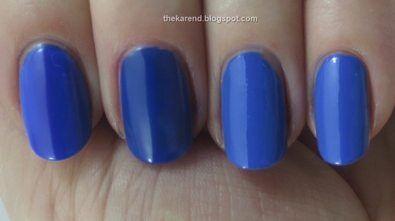 Left to right: L'Oreal two coats over white, L'Oreal three coats alone, NYC two coats, Sally Hansen two coats. The L'Oreal shows its neon-ness here, popping over the white and drying less shiny than the two true cremes. Alone, it's darker than the other two blues; over white, it's still a tad darker. They NYC looks to have a touch less white in it than the old Pacific Blue, but it's close enough that it would make a fine substitute if you didn't stock up on Pacific Blue when the panic hit the nail-o-sphere.
