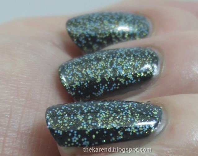 Teal Beam has small matte glitter in turquoise and pale yellow green plus fine gold shimmer. I did two coats of it plus topcoat over Maybelline Walk in the Park, a very dark green creme.