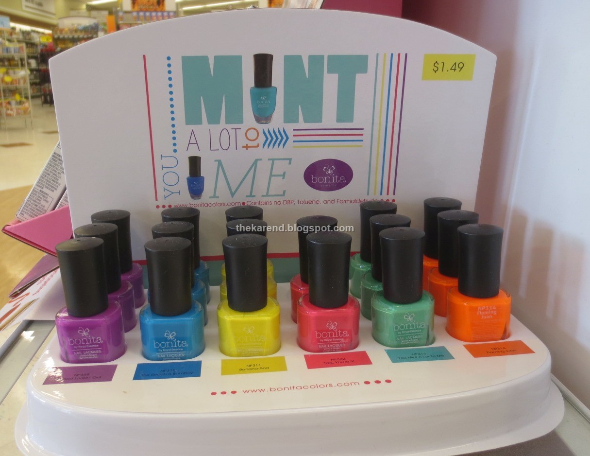 Rite Aid also had a Bonita display, You Mint a Lot to Me, with a different bottle style (and a lower price—$1.49 versus the $2.49 for the previous ones, quite a deal considering these are .4 oz. compared to the .5 oz. of the others). Six colors here: Good Lookin' Out, This Beach is Bombay, Banana-Ana, Tag You're It, You Mint a Lot to Me, and Flaming Juan.