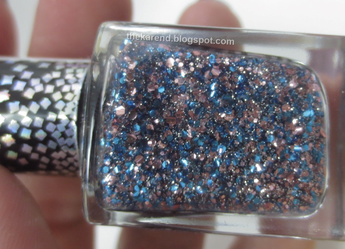 I blinged up the purple with another glitter from the R crown brand, shade 03, a mix of deep sky blue and dusty pink hexes with tiny rose gold speckles.
