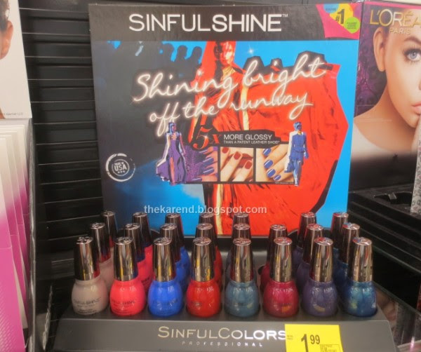 Walgreens also had a sinfulShine display called Shining Bright Off the Runway with these colors: Prosecco (new), All the Rage, Most Sinful, Devious, Set the Mood, Haute Shine (new), Nouveau Purple, and Shining Couture (new).