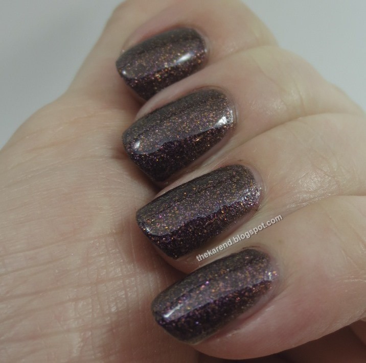 I think this one is pretty and perfect for fall; I would not wear it without topcoat, though, as the shiny seems to bring out the colors of the microglitter.