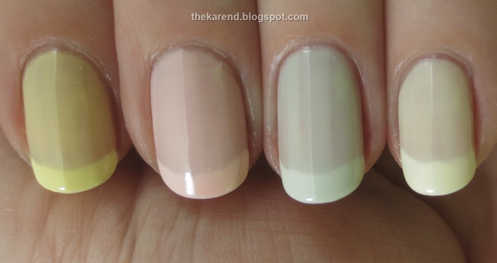 My first thought with pale sheers is a French manicure, so I freehanded some white tips (with Sally Hansen Insta Dri OMGhost) and then did three coats of the Wet Paint colors, starting with the pastel yellow Part-Time Blonde on my index finger (top in photo below), then the pink Cameo Blush, pale blue Bluesy Woozy, and ivory Villa Blanca on my pinky. (What looks like streaking on my ring finger is just my ridges—I didn't do a base coat and that finger is more ridgey than the others. I also got a little sloppy on my pinky and globbed along one side.) I think this mani would be perfect for spring; it looks like Easter candy to me.
