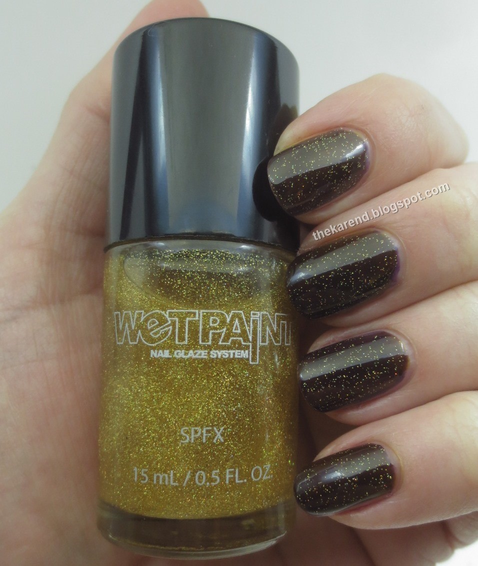 Despite having already had some snowy days, I'm not ready to let autumn go, so aimed for a warm fall-appropriate look for my last experiment. I started with two coats of Grape Minds Think Alike, then added one of Raincoat Slicker, the yellow Wet Paint jelly, turning the purple to a deep rich brown, and finished with one coat of Stardust, another of the Wet Paint Special Effects.