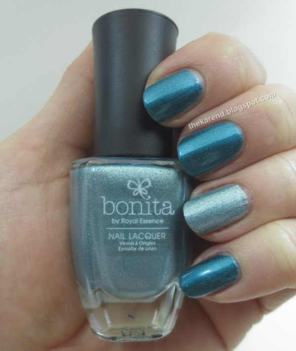 I got one more of the metallics, the silvery blue that shares a name with the whole display, Greetings Earthlings. I did one coat of it as an accent nail with Bonita Salon Made to Envy, a turquoise shimmer, which was a two-coater.
