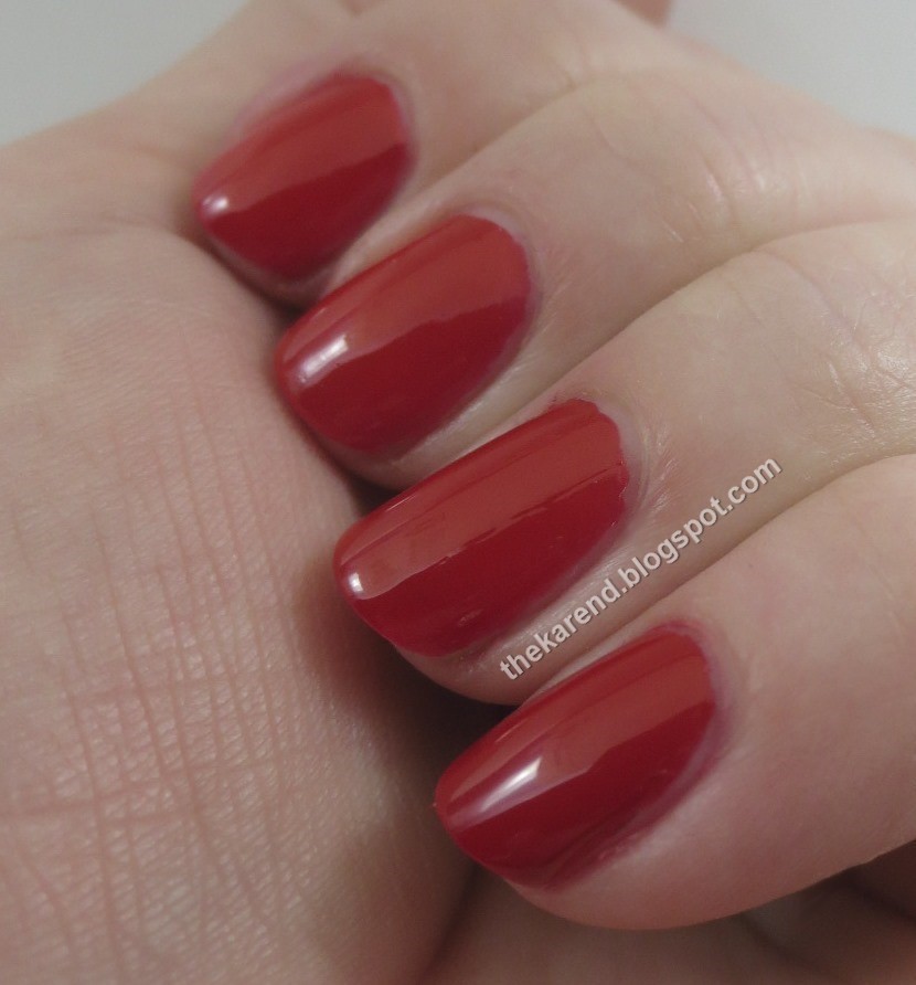 Fifth Avenue, a classic red creme, rounded out the trio. This was also a one-coater (though two would have been better to disguise the ridges on my non-basecoated ring finger).