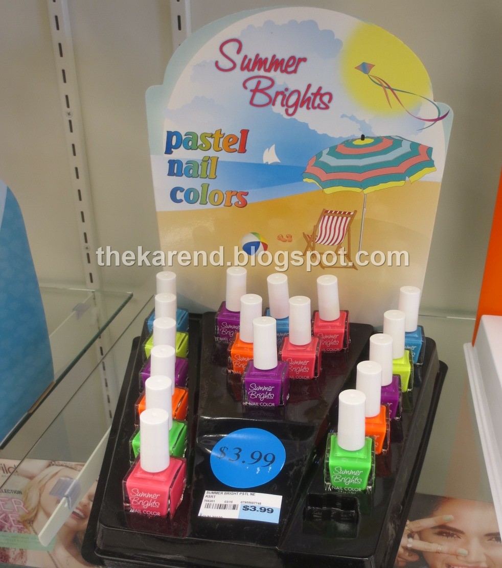 The seasonal Summer Brights polishes have shown up at Rite Aid for another year. It still says "pastel nail colors" on the display despite none of the colors this year being pastels. (At least some of them were last year.) I know they didn't just reuse the same display cards, as last year's had Blue Cross branding on it and this year's does not, despite the bottles looking the same.