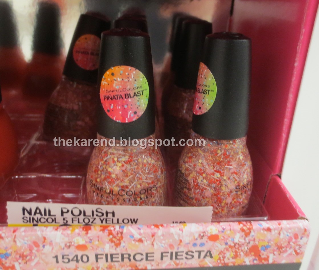 I ventured in to Target based on rumors of a SinfulColors glitter, and I found it in this Spring Fever display. All the other shades I'd seen before, but not Fierce Fiesta in the lower right. All the shades in this group (some sold out of this particular display), starting top left: Sail La Vie, Flower Power, 24/7, Petal Be the Day, Navy I Do, Super Nova, Flight to See, Snow Me White, Innocent, Zest of Times, Why Not, Ruby Ruby, Lavender, Thimbleberry, Fierce Fiesta. The Fierce Fiesta bottles have a Piñata Blast label on the handles, which I've not seen before; makes me wonder if it'll show up in a shelf top display with some friends soon.