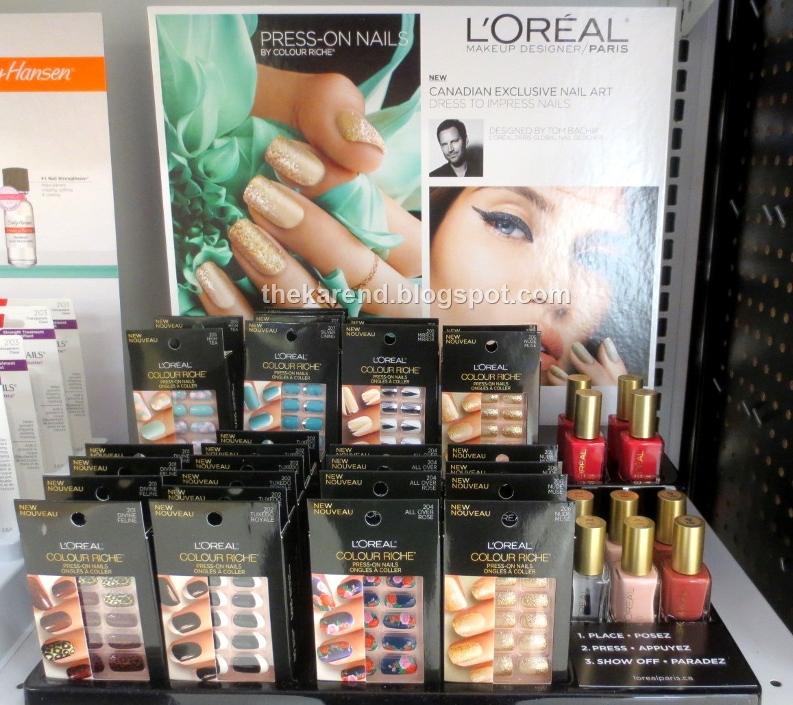 I'd never seen fake nails from L'Oreal before I came upon this next display at Shoppers Drug Mart, which has "Canadian Exclusive Nail Art Dress to Impress Nails" from Colour Riche. Front row: Divine Feline (red/black/gold leopard print), Tuxedo Royale (black with white Funky french), All Over Rose (red/pink roses on blue), Nude Muse (ivory with gold mix glitter). Back row: High Tea (pink/white flowers on mint), Silver Lining (turquoise with silver ruffian), Mirror Mirror (white with silver triangles), Nude Muse. There's polish here, too, but I don't believe those are exclusives or even limited edition: Top of the Line (clear), How Romantic, Spice Things Up, Crazy for Chic.