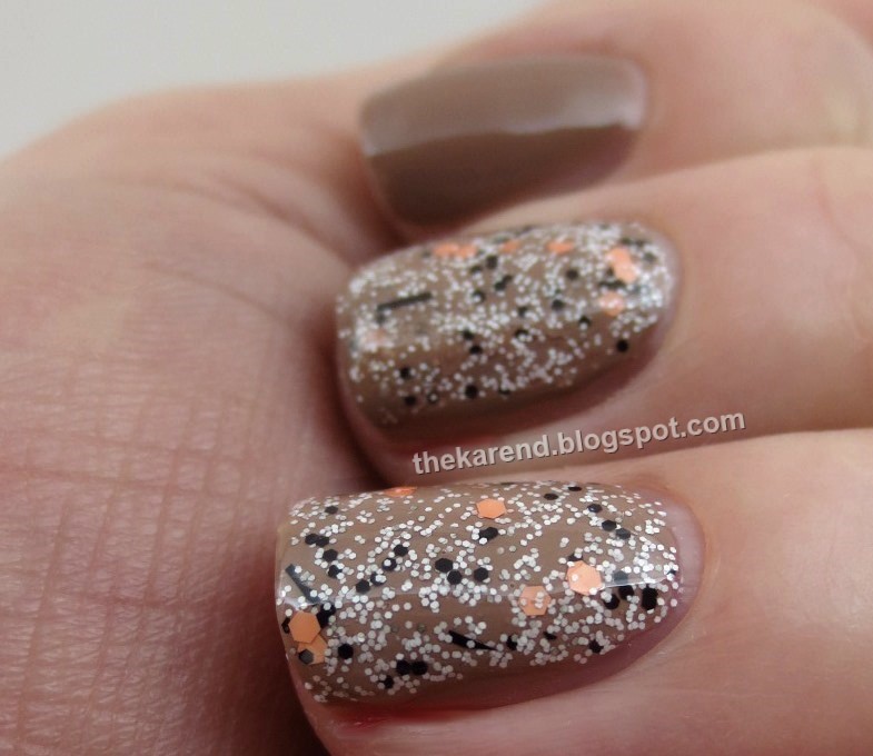Revlon Serene, a light brown creme new to the core lineup, got matched with Quo Contemporary, which has tiny white dots, small black hexes, black bars, and medium sized light orange hexes in a clear base.
