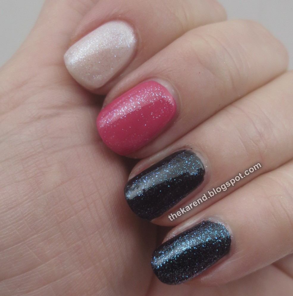 Before I put these away, I wanted to see Dance over other colors. Top to bottom: Wet 'n' Wild Megalast Break the Ice (white shimmer) plus 1 coat of Dance, Wet 'n' Wild Megalast Cherry Blossom on Top (hot pink creme) plus 1 coat of Dance, Wet 'n' Wild Wild Shine Black Creme plus 1 coat of Dance, black plus 3 coats of Dance. Dance adds a nice boost of shimmer to the lighter bases, but the shimmer and shift really pop over black.