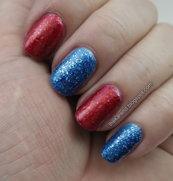 Sea to Shimmery Sea's counterpart is called National Holi-Yay; it's the blue (and maybe silver—again the base is tinted enough to make it hard tell) version of Firewerk. I did the same diagonal swipe as I did with the red. Since Sea to Shimmery Sea is more glitzy than The American Sheen, it doesn't contrast as much with the bling of the glitter.