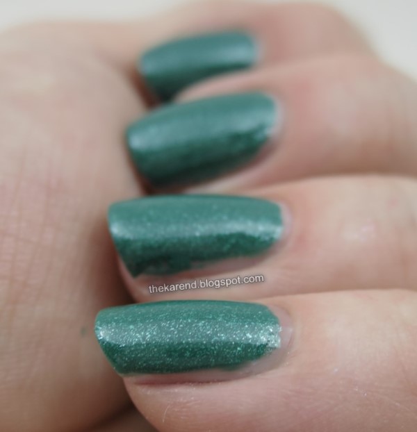 We're In Tents is a dark green with silver shimmer. This was nearly a one-coater, but I used two.