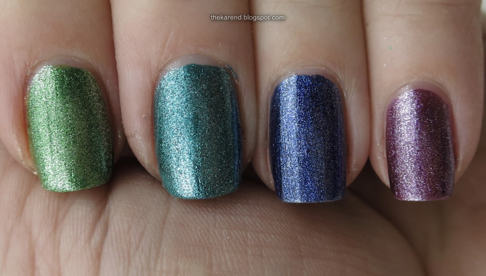 Lastly, the Karen colors: green, teal, blue, purple. Top to bottom: Sheen Green, Metallic Seaweed, B Dazzled Blue, Razzmic Berry. I did one coat of all but the green; that seemed better with two.