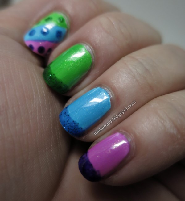 On to the cool hues. Index finger stripes are Lit-terally dotted with Filthy Rich, Zzzapped with Love is Love, and Hella Bright with Drag Queen. You can figure out the combos on the other nails, I'm sure.