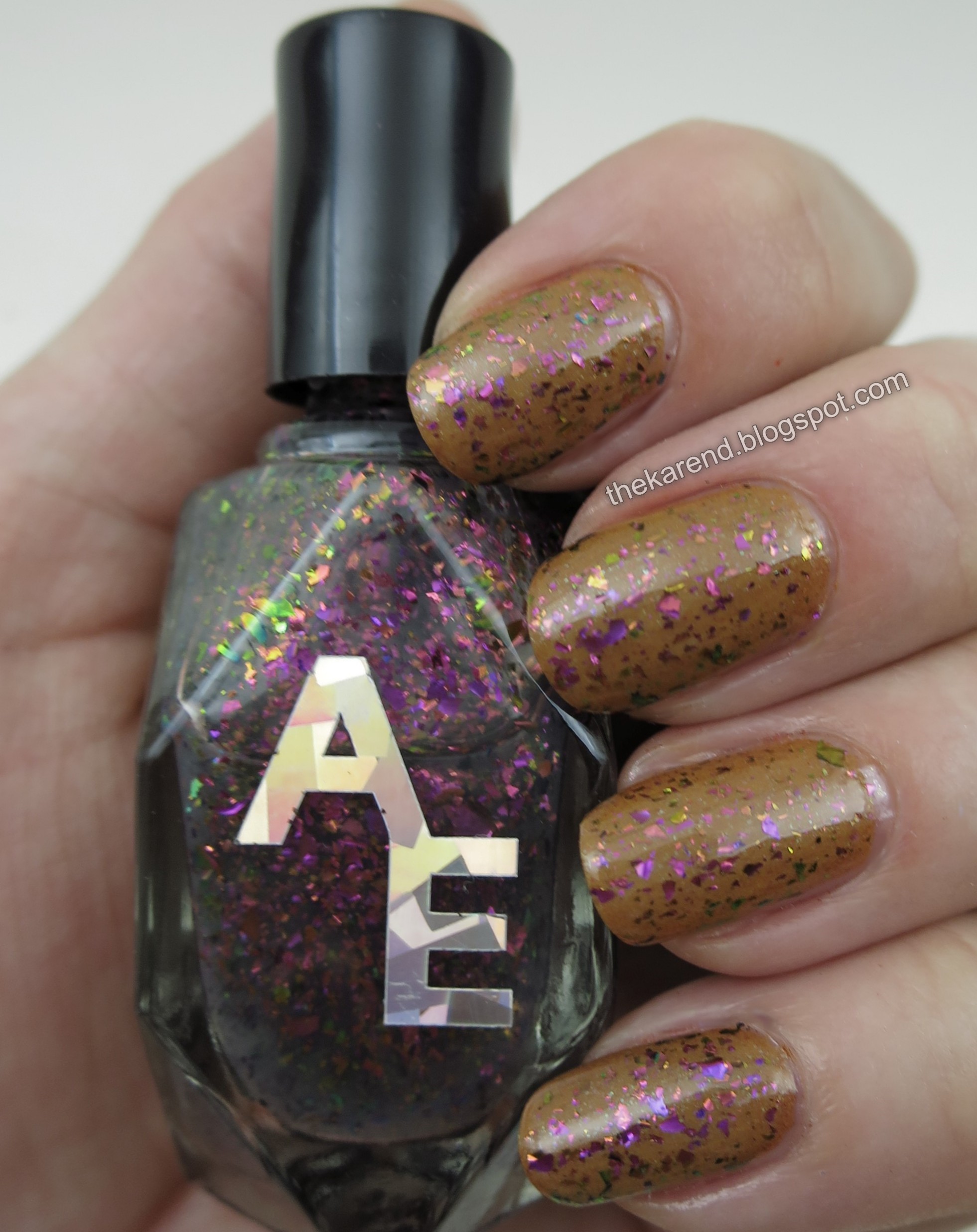 I paired Being Myself with another Alter Ego I picked up at IEC, the flaky topper Fall for Fall, which has green/gold and purple/magenta/copper shifts in it.