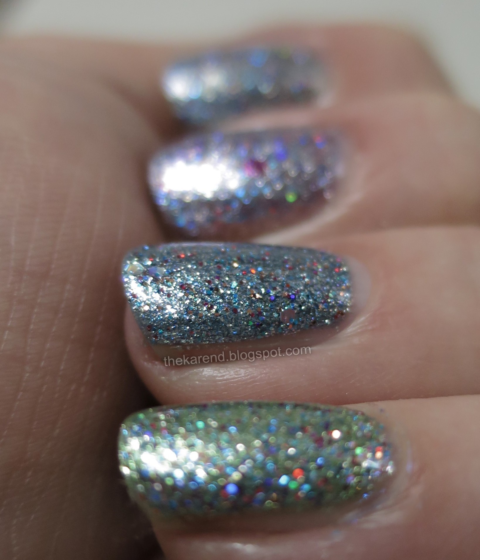 I did Skittles with four of the colors: Galaxy (dark silver), Princess Dream (lavender), Ocean Tear (blue), and Forest Fairy (green). Galaxy and Forest Fairy were three coats; the other two took two. All have a quite nice metallic finish ... or maybe it's a foil finish ... I am never sure where the line is between those two. Very good payoff for a $3 polish (I think that's about what they were).