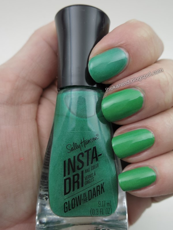 Hallo-green is the most pigmented of the glow in the dark ones, yet I still paired it with a complementary Insta Dri shade, Granny Smith Apple, which was on a recent nail wheel I posted. Index finger is three coats of Hallo-green and the other digits have one coat of Granny Smith Apple topped with one coat of Hallo-green.