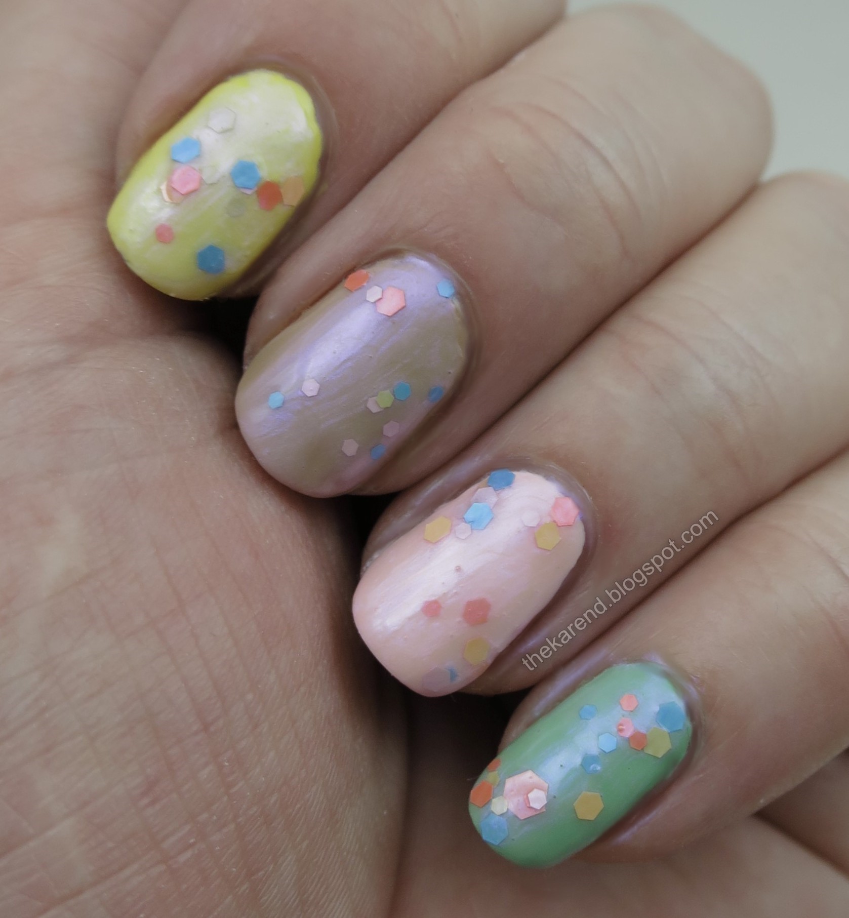 Adding a single coat of Wish Upon a Star to those Skittles and slicking on a clear topcoat yielded four pretty nearly identical nails. Did the blue tones of the flakes show up more on the blue violet base? Maybe, but if so, the difference is slight. The good news is using Wish Upon a Star on a creme base looks just as good as two/three coats of it alone, so I can enjoy it for more manicures if I layer it.