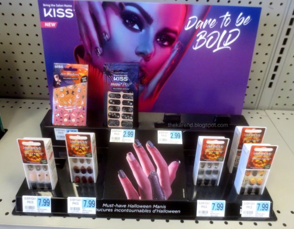 Rite Aid was still setting up their Halloween aisle when I stopped in, so I'm not sure if the lack of pumpkin polishes was temporary (I never did see them last year), but they did have the Kiss Perfectly Wicked display with limited edition fake nail sets (and glue), as well as a Kiss Dare to Be Bold display which had Impress nail sets and Kiss stickers and strips.