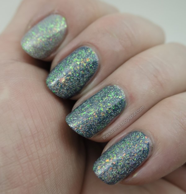 Birch has a grey base that's been filled up with orange/green shifty flakes and tiny sparkling holo flakes.