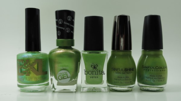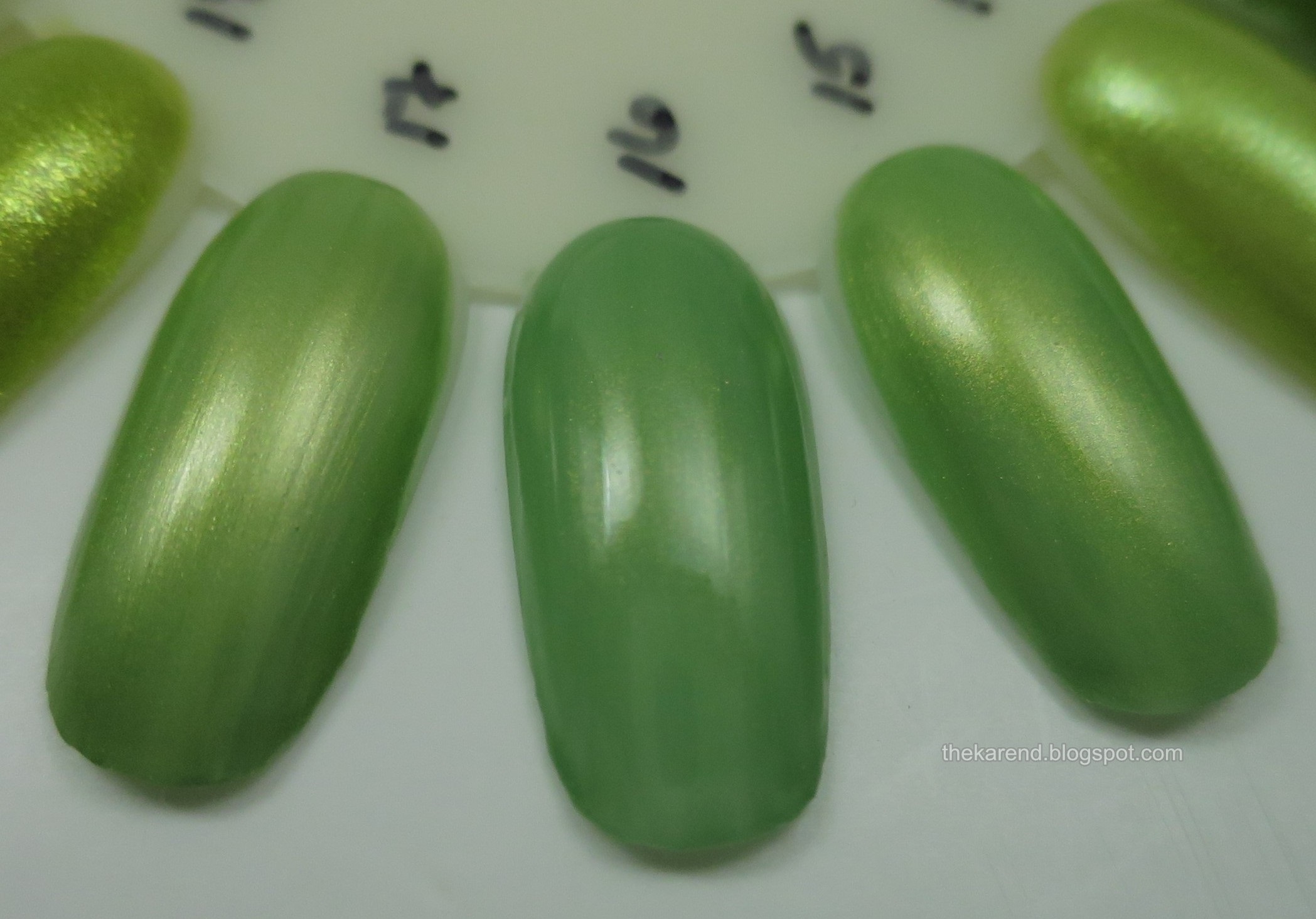 I wasn't sure how sheer Slime All Yours would be, so I hedged my bets by doing another layering experiment on my index finger. So on my index (top) I have Hallo-green (green creme from 2020) topped with one coat of Slime All Yours, then on my other fingers I have three coats of Slime All Yours.